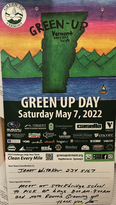 Posted on April 27, 2022 by Jill Gifford Green Up Day Green Up Day is May 7. Contact Janet Whitaker or Bill Edgerton with questions.